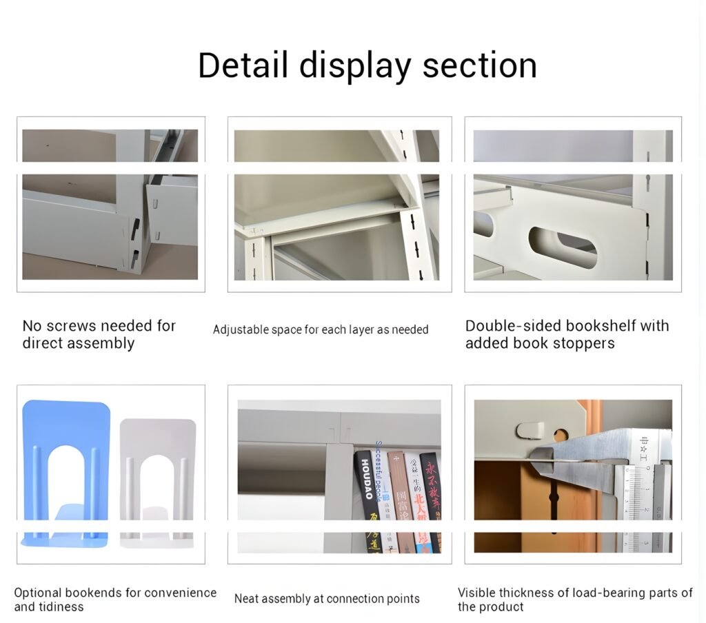 Setting up library furniture has never been easier. Our Durable Modular Metal Bookshelves for School and University Libraries feature a groundbreaking no-screw direct assembly system. Simply align the components and watch them snap into place effortlessly.