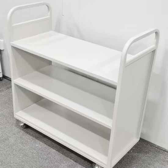 In hospitals and clinics, this cart efficiently transports medical records, supplies, and educational materials. The durable construction withstands frequent cleaning and sanitization. The three-tier flat book cart’s mobility makes it perfect for delivering materials to different departments or patient rooms.